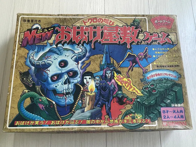 こちらも基本は双六ゲームですが、道中で出会うおばけとの戦いの勝敗が、「どくろルーレット」によって決められます。ルーレットを回したときに発せられる音声によって、例えばおばけの断末魔がきこえればプレイヤーの勝ち、逆におばけの笑い声ならば負けといったかたちです。こちらもほかのゲーム同様80年代の発売と思われます。まだまだ音声ユニットが珍しい時期ですね。ちなみにおもちゃ用の音声ユニットは90年代初頭に一気に安価・高性能化しておもちゃに多く使用されるようになります。