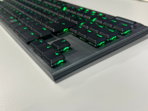 よくあるゲーミングキーボードとは違い、かなりシンプルなデザインで一部のキーが差し色となっています。
