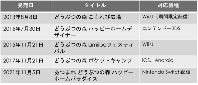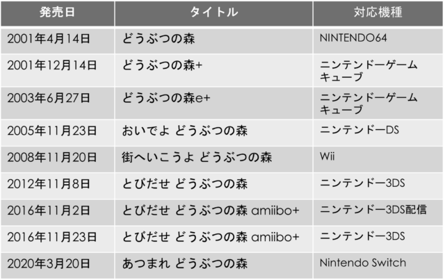 少し『どうぶつの森』の話から脱線してしまった感がありますが、そうでもありません。ちょっとここで、『どうぶつの森』シリーズの変遷を一覧にしてみたので見ていただけますか。
