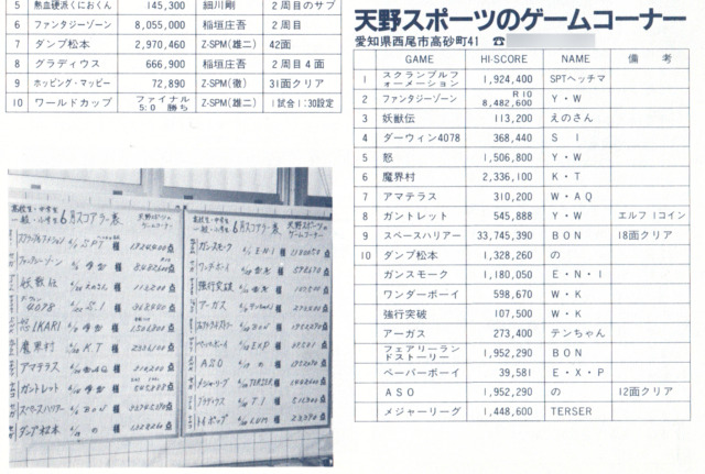 アーケードゲーム情報誌「ゲーメスト」(新声社)では、全国のゲームセンターからハイスコアが寄せられ、その集計で毎月のトッププレイヤーを決めるページがン人気を博していた。『天スポ』はこの集計システムが正式にスタートした創刊第3号(1986年9月/山瀬まみが表紙)から集計店として名を連ねている。その後ハイスコア集計に参加するお店は一気に増加することになるが、その時点では愛知県でたった2軒しかないうちの1軒だった。
