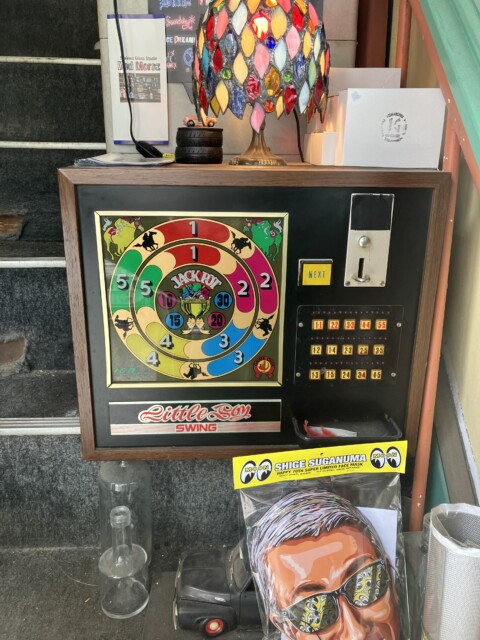 ロイヤル電子のヒット作『ロイヤルマージャン』(ロイヤル電子/1981)のインストラクションカードが入っているが、前に来た時にすでに故障していると伺っていた。ハードに使い込まれたボタンのアルファベット表記が消えてしまい、マジックで書き足されたコンパネをしみじみ眺め、この台がこの場所で過ごしてきた長い歴史に思いを馳せる。