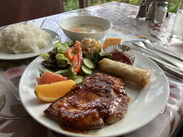 まもなく運ばれてきたポークソテーも実に堂々としたサイズ。味は生姜焼きなのだろうが、これは確かにポークソテーだ。付け合せもバラエティに富んでおり、一本丸ごとの春巻が存在感を放っている。1100円とは思えぬ豪華さに相好を崩し、ご機嫌でランチに取り掛かる。