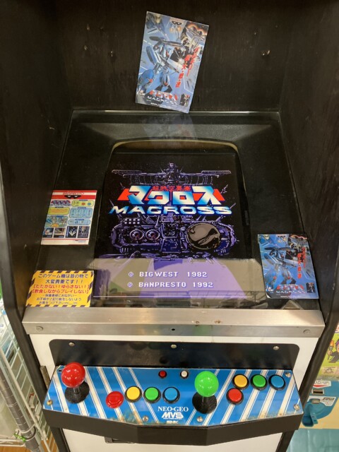 写真撮影の許可もいただいたので、店頭に置かれた『超時空要塞マクロス』(バンプレスト/1992)をプレイすることに。昨年12月にアーケードアーカイブス(ハムスター)にて初の家庭用移植がなされ、アケアカアワード2024の最優秀賞を受賞した人気作品だ。アニメ版権のゲーム化作品の移植には通常よりも多くのハードルがあるがそれをひとつひとつ解きほぐして移植を実現したことは非常に意義深い。