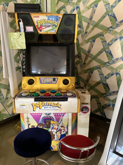 かつては汎用筐体だけでなく大型筐体や音ゲーもあったというが、いまは『ポップンミュージック』が一台だけポツリと残されていた。電源スイッチが前面に引かれた上に貼り紙までしてあるため、この台だけいまでも遊べそうな佇まい。