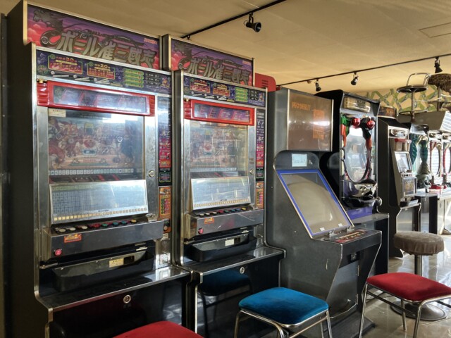 奥の方にはパチンコ・パチスロ機や麻雀ゲーム機が並べられ、こちらは電源を入れればいまにも動き出しそうな感じ。その中には私の好きな『ボール雀三国志』(SHOKEN)が2台紛れ込んでいるのにグッとくる。麻雀の役を揃えていくパチンコ、いわゆる“雀球”アレンジのメダルゲームだ。ちなみにSHOKENは埼玉県羽生市に本社を持つ地元企業でもある。
