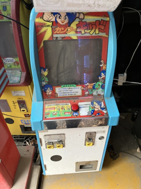 貼り紙をめくってみたら、キッズメダル機『カンフーキッド』(コナミ/1993)が姿を現した。その奥でホコリを被っているのは『お宝ロコモ』(サミー/1999)だ。