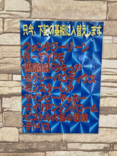 周囲にはファミコンソフト『たけしの挑戦状』『マイティボンジャック』『高橋名人の冒険島』などのパウチしたチラシが貼られている。他にも『妖怪道中記』『魔界村』『沙羅曼蛇』『ファイナルファイト』のアーケード版チラシもあり。タイトルのチョイスに店主の趣味を感じる。
