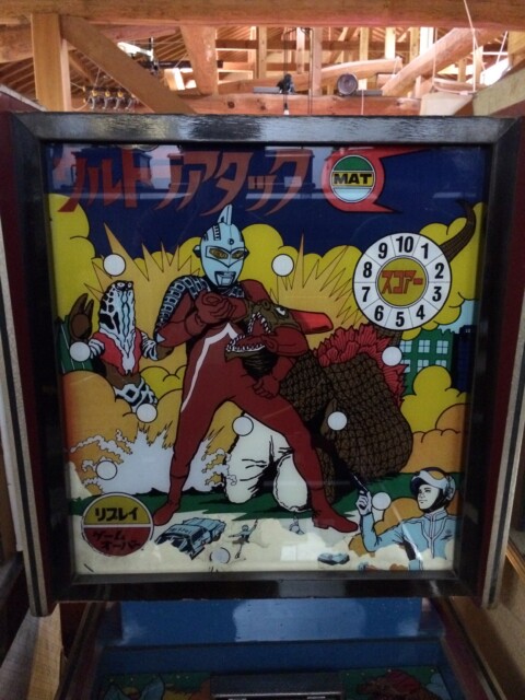 バックグラスにウルトラセブンが描かれた「ウルトラアタック」という同型のフリッパ―マシンが犬山市の日本ゲーム博物館にあるが、こちらもいろいろ詳細がわかっていない(下の写真は2014年に日本ゲーム博物館で撮影)。セブンは1967年放映なのだが、何故か「ウルトラアタック」にもMATマークが描かれており(セブンは「ウルトラ警備隊」)、どちらが先に製作されたのかあるいは同時期にリリースしたものなのか……謎は深まるばかりだ。