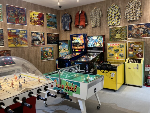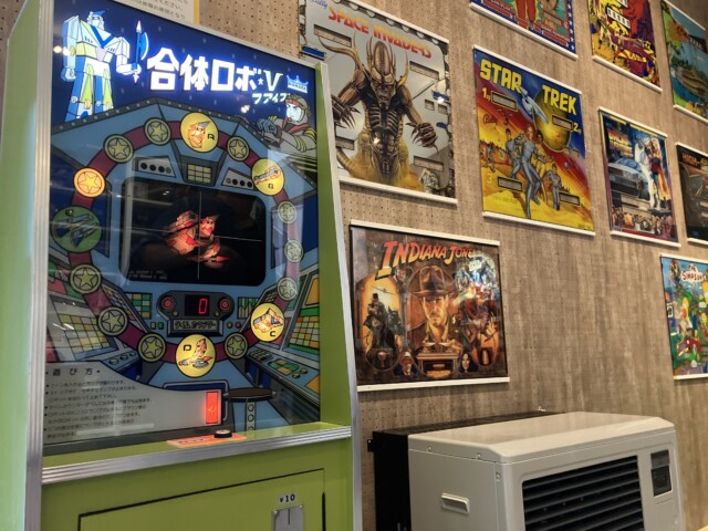 壁側にはピンボールの『バック トゥ ザ フューチャー』(データイースト/1990)『スターウォーズ』(スターン/2017)、エレメカの『ミニドライブ』(関西精機/1959)、『山のぼりゲーム』(1981)『タッチアクション』(1978)『合体ロボ☆V(ファイブ)』(1981)といった、こまやの人気作などをプレイすることができる。