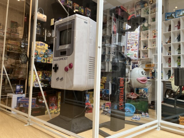 その隣にはおもちゃ屋さんに置かれていた巨大ゲームボーイのオブジェとバーチャルボーイの試遊機がお出迎え。任天堂ファンなら家に置いてみたいと夢想するこの2台が並ぶ様に写真を撮る手にも思わず熱がこもる。その周辺に配置されたグッズもひとつひとつが興味深く、時間さえあればもっと丁寧に見学していきたいところだ。