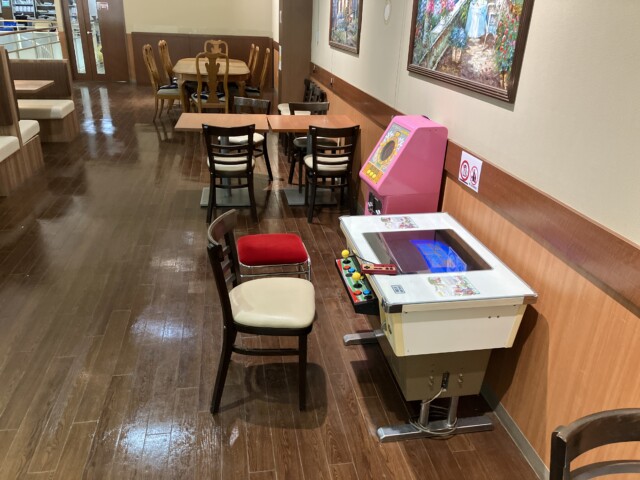ちょっとしたイートインスペースとなっている2階の壁際には、ポツンと1台だけテーブル筐体が置かれていた。だいぶ前にGoogleマップで発見してはいたがまだ健在だったか! よーしよし。