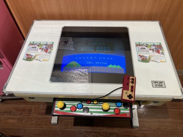 電源が入っており画面ではマリオが飛び跳ねていた。インストカードは海外版の『VS.SUPER MARIO BROS.』。テーブル筐体のコンパネの根本あたりからケーブルが伸び、ハドソンマーク“ハチ助”の入ったファミコンコントローラーが取り付けられている。レバー操作よりもファミコンコントローラーの方がプレイしやすいだろうとの配慮なのだろうが、ちょっと場違いなスーパーマーケットにしてはなかなかの芸が細かさだ。