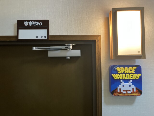 『レトロゲーム部屋プラン』は、すずらんの間一部屋のみ。入口に掲げられたインベーダーランプがその目印。テーブル筐体に純正コンパネをとりつけ、インストラクションカードは新日本企画(SNK)のOEM品。入っている基板はもちろん「スペースインベーダー」だ。