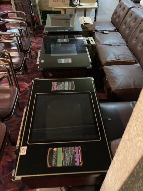 テーブル筐体は厨房寄りの奥側に3台、少し離れたところにぽつんと1台の計4台。すべて麻雀コンパネだが、ボタンが脱落していたりガムテープが貼られていたりしてどう見ても動きそうな様子ではない。1台だけ離れた場所にある筐体には椅子も置かれておらず、配置からしてもお客さん用の座席ですらないようで置き場所がないからとりあえずココに置いた感じ。
