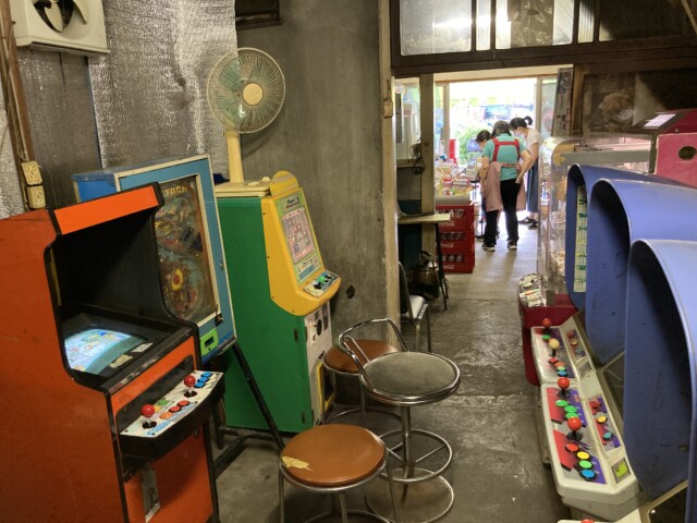入口入るとごく狭い小さな駄菓子売り場があって、その奥にひっそりとゲームコーナーがあった。埃をかぶったネオジオ筐体SC-19の庇が丸いタイプが4台、アストロシティが3台、さらにはテーブル筐体や駄菓子屋ミニアップライト、10円ゲームなどが勢揃い。表からはその様子が見えづらく、子どもたちの隠れ家のような雰囲気だった。