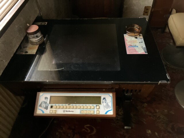 店頭にはポツンとルーレット機のパネルのようなものが放置されていた。あとで調べてみたところ『Rotary Junior』(関西企業/1975)のパネルのようだ。昔はゲーム機を置いてたのかもしれない。