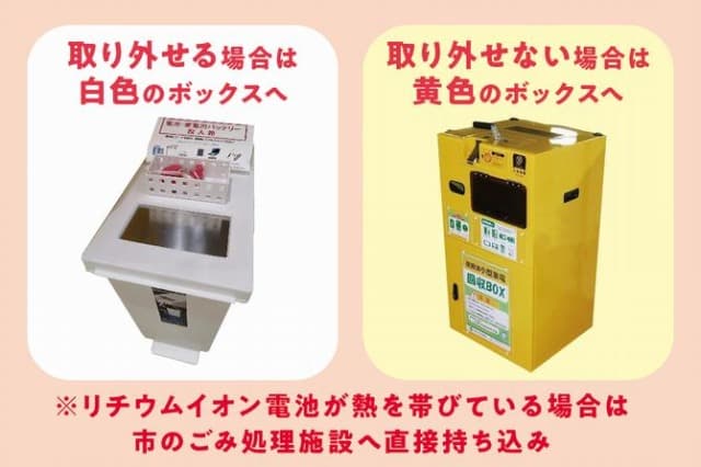 内蔵バッテリー式で簡単に取り外せない機種は、回収ボックスにそのまま入れられる場合もありますが、ルールは自治体や回収事業者によって異なります。