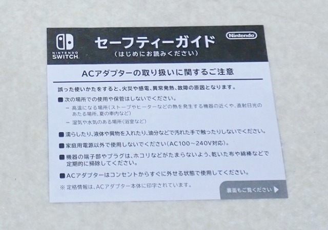 Switchを安全に使用するための注意事項が記載された用紙です。